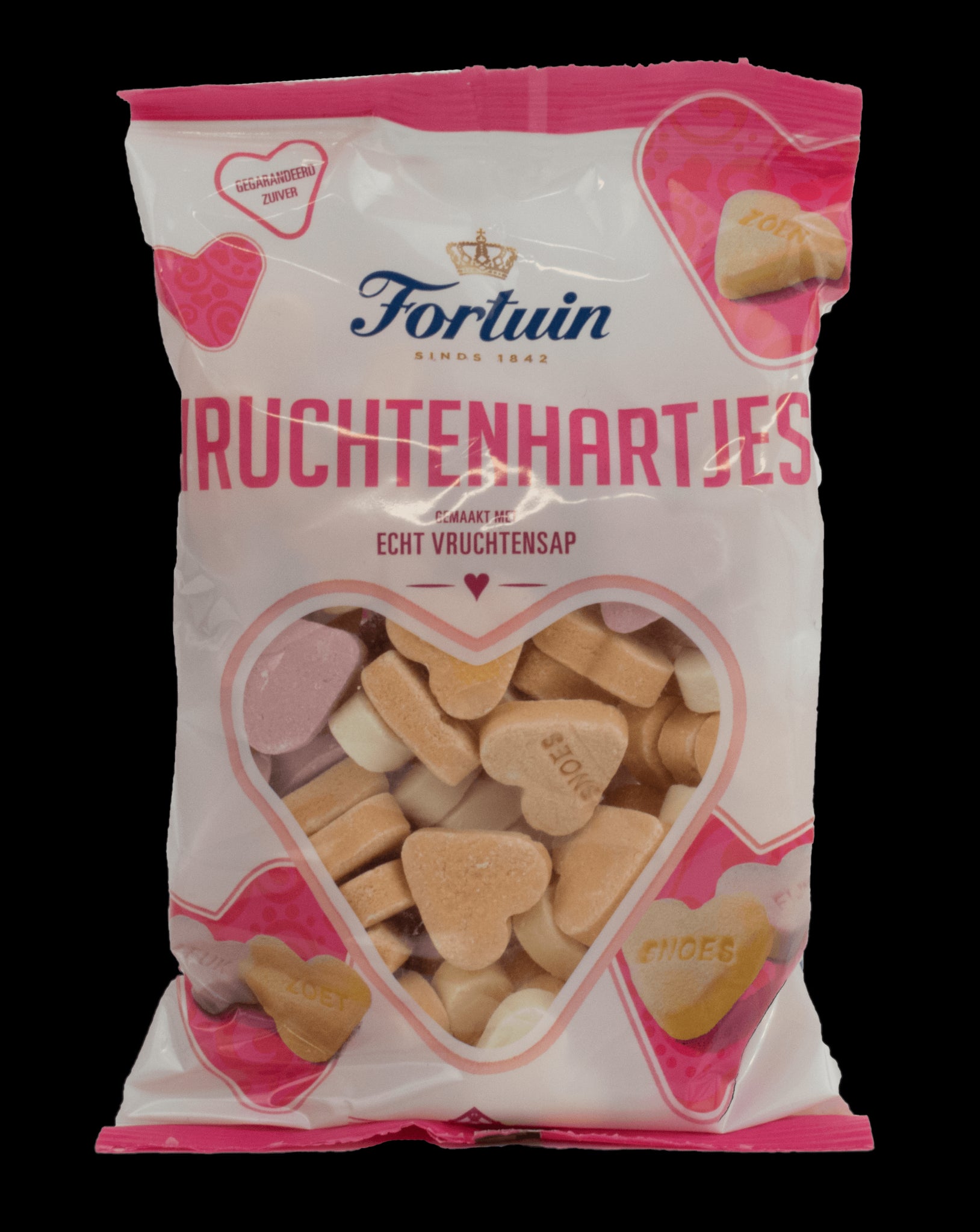 Chalky fruit flavoured heart shaped candy (vruchtenhartjes).
