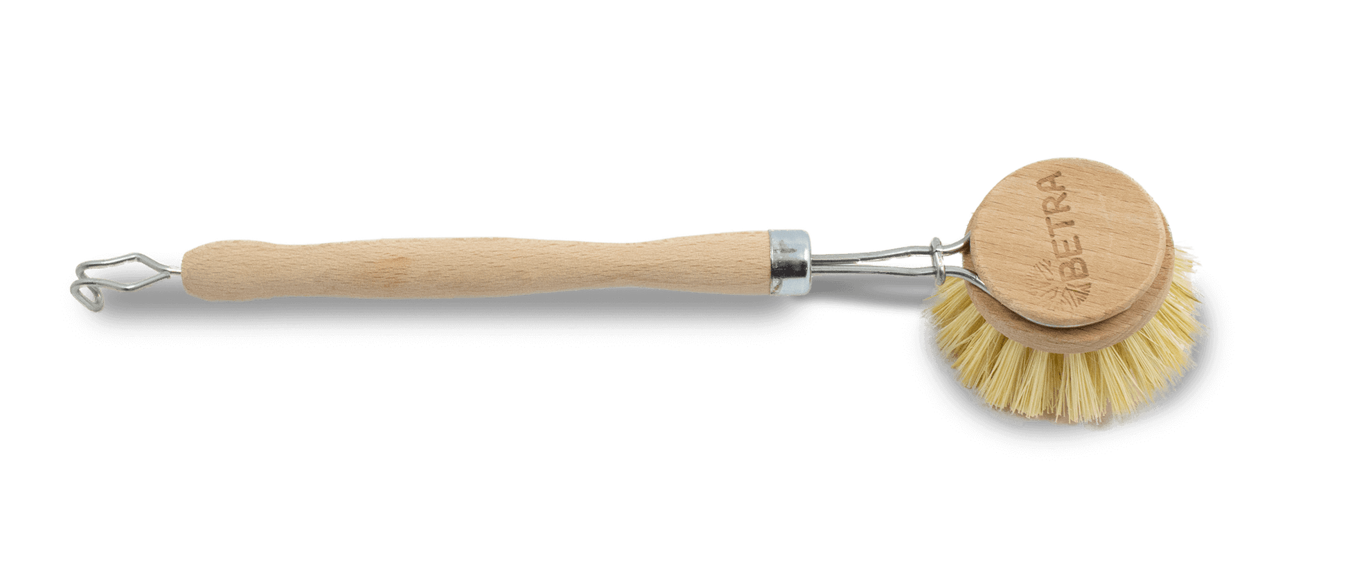 Wooden dish brush with natural bristles.