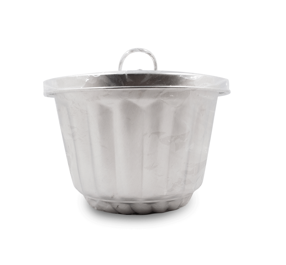 Aluminum pan and lid for making Dutch poffert. Similar to a bundt pan.