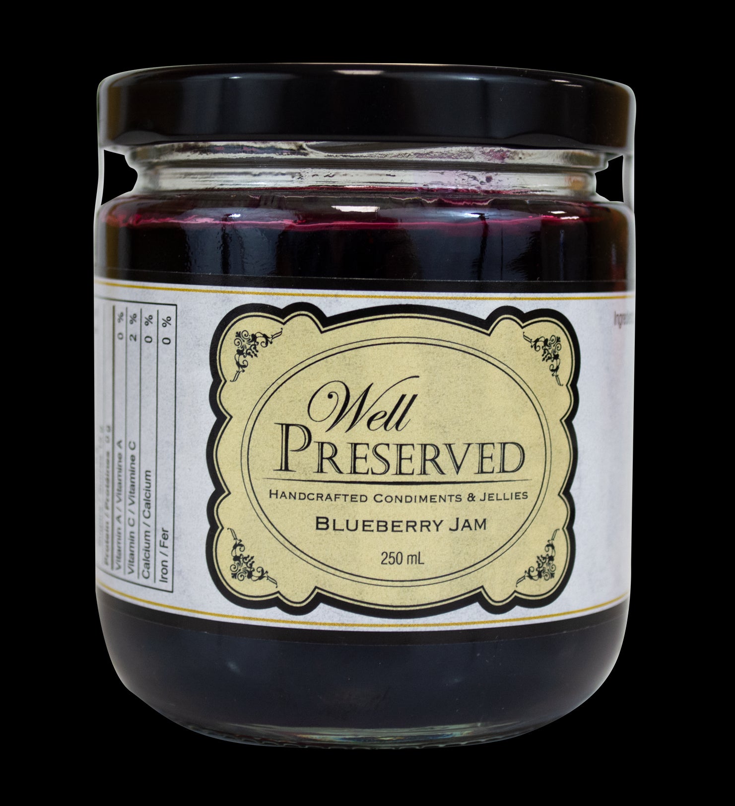 Blueberry jam made locally in Grimsby, Ontario. Proceeds from Well Preserved Jams go toward funding Community Living programs.