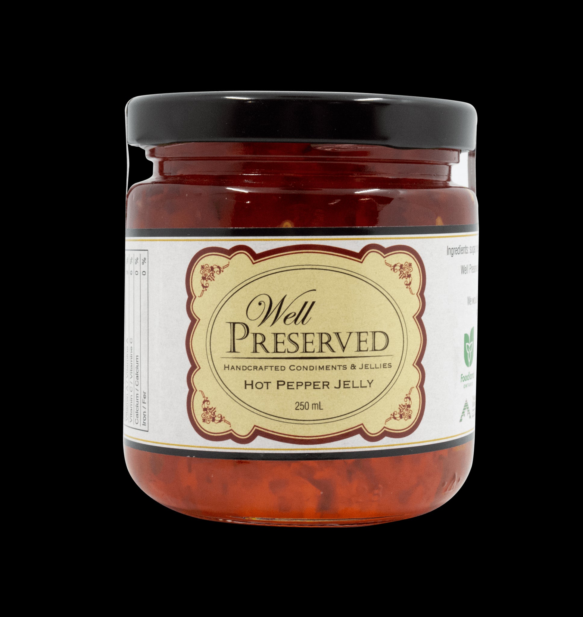 Sweet, hot pepper jelly made locally in Grimsby, Ontario. Proceeds from Well Preserved Jams go toward funding Community Living programs.