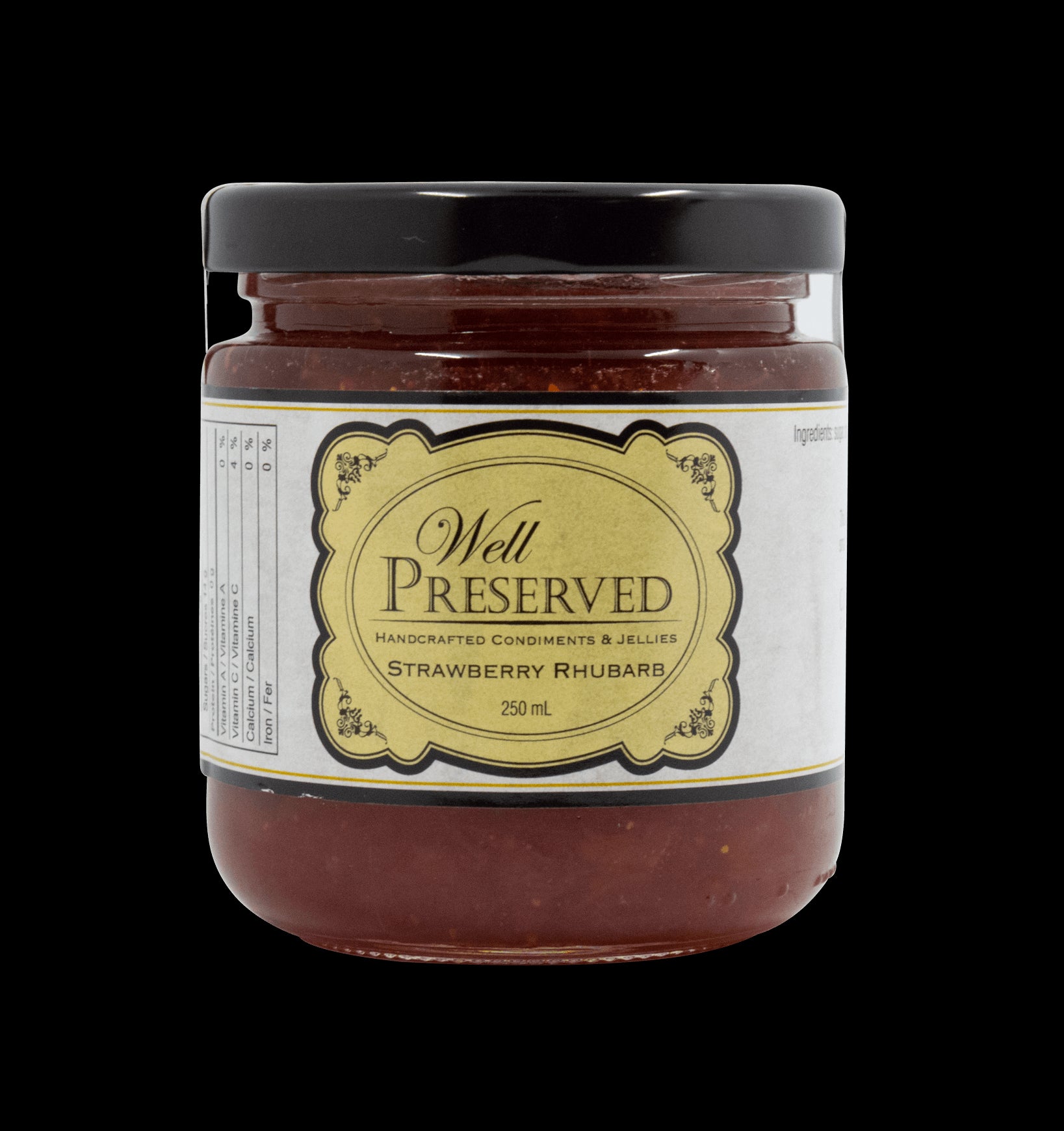 Strawberry rhubarb jam made locally in Grimsby, Ontario. Proceeds from Well Preserved Jams go toward funding Community Living programs.