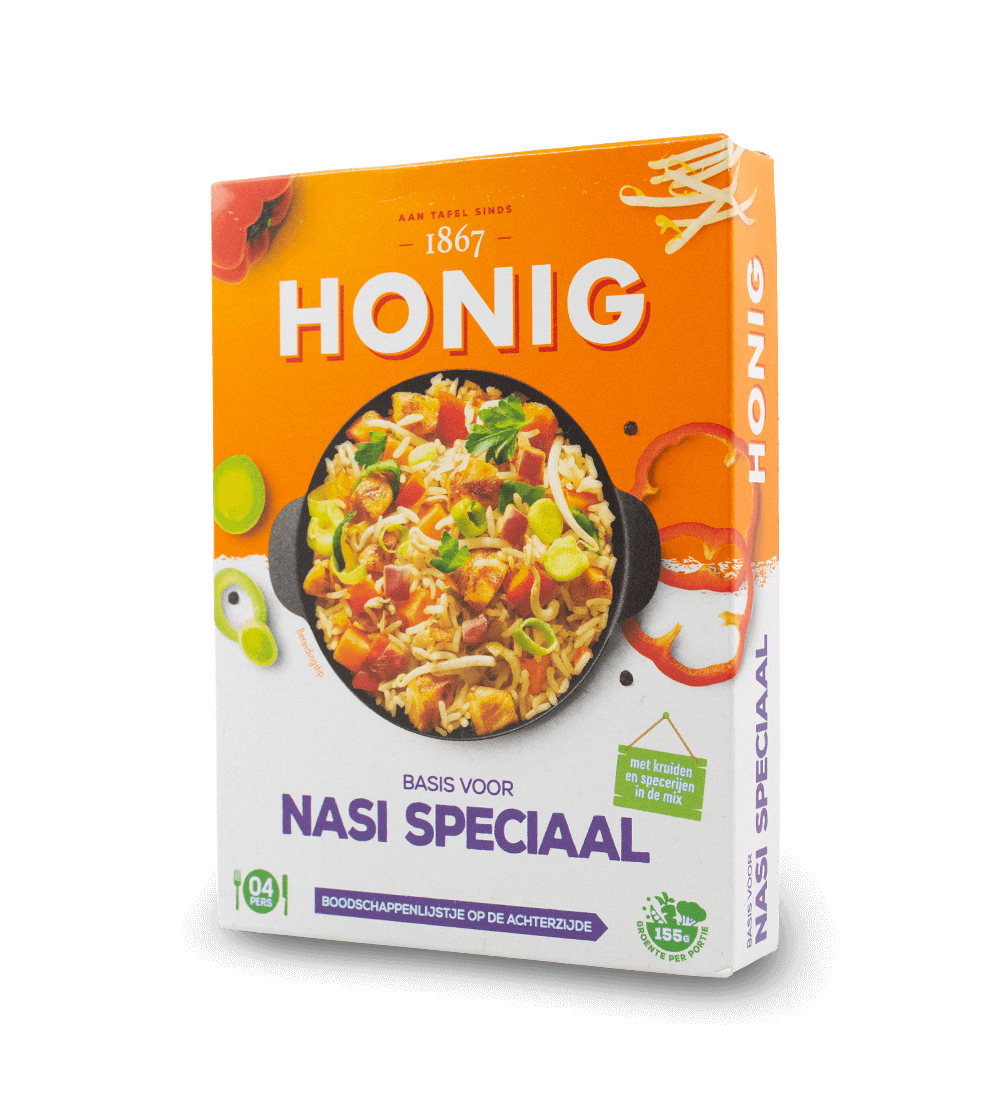 Honig basis for Nasi Speciaal is a mix with Eastern herbs and spices such as laos and garlic. By adding fresh ingredients you can quickly and easily put a delicious fried rice dish on the table!