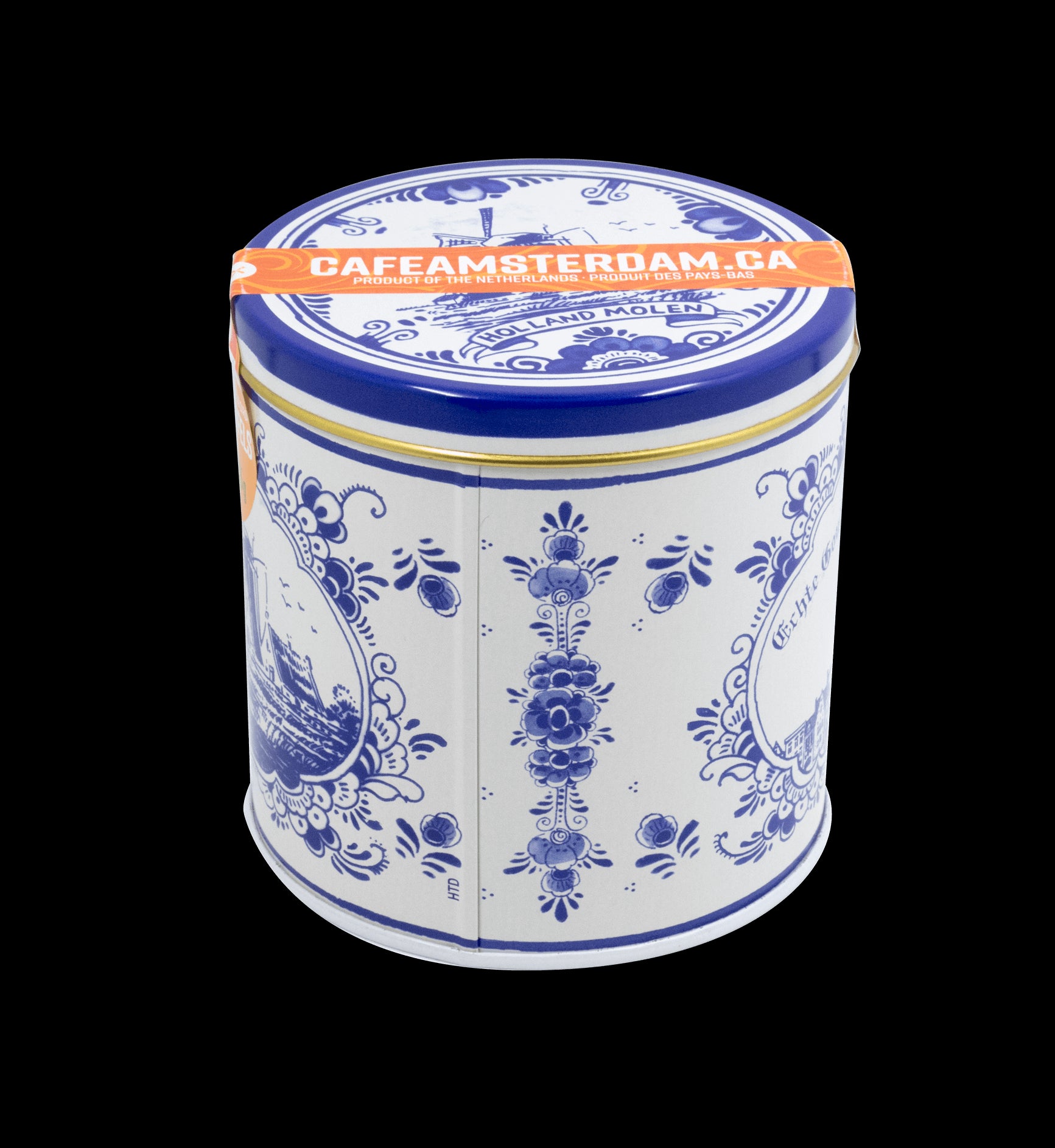 A delft-style tin containing 1 pack of 8 Cafe Amsterdam Stroopwafels.