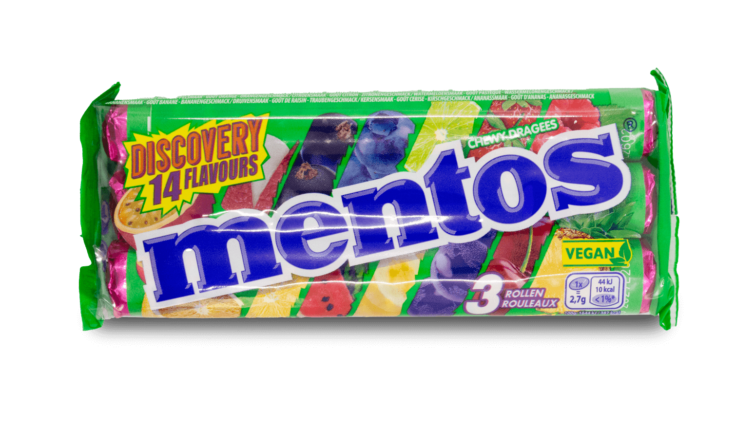 3 rolls of Mentos featuring 14 different fruit flavours.